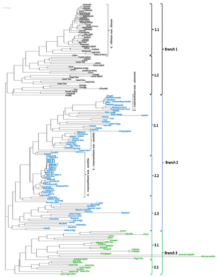 Finally, Branch 3 showed the greatest genetic distances among accessions and was divided into two sub-branches: Sub-branch 3.1 contained accessions of Fortunella spp., Poncirus spp., and wild relatives. Sub-branch 3.2 grouped several lime accessions of C. × limon var. limetta, C. × latifolia var. latifolia, and C. aurantifolia.