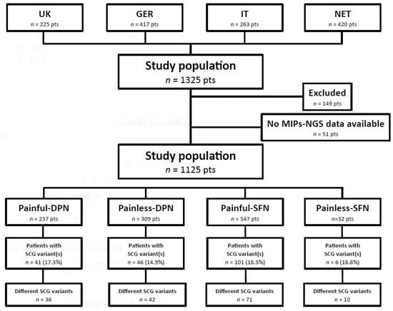 PROPANE study patients analyzed for potentially pathogenic SCG variants by single molecule Molecular Inversion Probe-Next generation sequencing (smMIP-NGS). Between June 2014 and September 2016, patients with painful and painless diabetic peripheral neuropathy (DPN) and idiopathic small fiber neuropathy (SFN), recruited in four different centers, were screened for SCN3A, SCN7A-SCN11A, and SCN1B-SCN4B variants by smMIP-NGS. The variants’ pathogenicity was classified according to current classification guidelines []. UK, University of Manchester, United Kingdom; GER, Deutsche Diabetes Forschungsgesellschaft EV, Germany; IT, Fondazione IRCCS Instituto Neurologico “Carlo Besta”, Italy; NET, Maastricht University Medical Center+, the Netherlands; n, number; pts, patients; Painful-DPN, painful-diabetic peripheral neuropathy; Painless-DPN, painless-diabetic peripheral neuropathy; Painful-SFN, painful-idiopathic small fiber neuropathy; Painless-SFN, painless-idiopathic small fiber neuropathy; SCG, sodium channel genes.