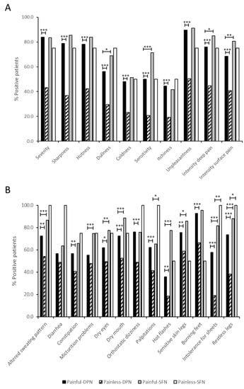 For the SFN-SIQ, 12 of the 13 symptoms were more often reported by patients with painful neuropathy compared to painless neuropathy, with only diarrhea being reported equally for both patient groups. Nine peripheral neuropathy related symptoms were reported significantly more often by patients with painful-SFN compared to painful-DPN. Bowel problems, orthostatic dizziness, and burning feet were reported equally in both painful neuropathy groups (Figure 2B).