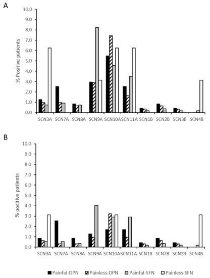 There is a strong body of evidence implicating sodium channel genes in human painful disorders []. Gain-of-function mutations in SCN9A, SCN10A, and SCN11A genes are associated with painful neuropathy as a consequence of dorsal root ganglion (DRG) neuron hyperexcitability. The pathogenic role of mutations in SCN9A, SCN10A, and SCN11A genes has triggered substantial interest in other sodium channel genes such as SCN3A, SCN7A, SCN8A, and SCN1B-SCN4B. To date, this is the first study that has investigated the presence of genetic variants in ten SCG (SCN3A, SCN7A-SCN11A, and SCN1B-SCN4B) in a large cohort of painful and painless diabetic peripheral neuropathy (DPN) and painful and painless idiopathic small fiber neuropathy (SFN).
