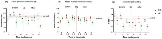 Alpha-diversity indices—(A) Shannon index and (B) Inverse Simpson—and richness index—(C) Chao1—plotted against the time to diagnosis (years) in children with type 1 diabetes mellitus (T1D, n = 59; red circles) or inflammatory bowel diseases (IBD, n = 23; green squares). The number of samples available in each time category before and after diagnosis is marked below the Standard Error of Mean (SE) line for T1D and IBD. The plot shows the deviations of cases against the control population (horizontal center line with the SE of the control). The vertical line marked with Dg represents the time of diagnosis. To the left of the Dg line represents pre-diagnostic samples, while to the right represents post-diagnostic samples.