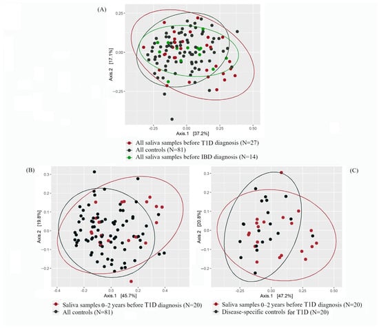 Beta-diversity did not differ between pre-T1D samples (n = 27) and control samples (n = 81) (corrected p = 0.27) (Figure 2A). Further inspection showed that within 0–2 years before diagnosis, pre-T1D saliva microbiota (n = 20) clustered differently than the saliva microbiota of controls (n = 81) (Figure 2B) (crude p = 0.04). However, this difference was attenuated after correction with the Benjamini–Hochberg method (corrected p = 0.48). A similar finding was seen when the pre-T1D samples were compared with the T1D-specific control samples (i.e., saliva samples of controls, which were obtained at the same time as the pre-T1D samples; n = 20; crude p = 0.08, corrected p = 0.50) (Figure 2C). All corrected p-values were obtained using the permutational analysis of variance (PERMANOVA) test.