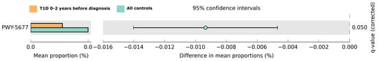 Predicted functional pathway differences in the T1D cases 0–2 years before diagnosis (n = 20; in orange) samples and all controls (n = 81; in light green). Differences in the mean proportions are shown with 95% confidence intervals. Results are based on Welch’s test; the q-value was obtained using the Storey correction method.