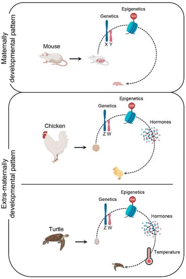 Schematic view of key factors influencing the embryonic sex determination and differentiation in maternal and extra-maternal developmental patterns. In mouse, the process of embryonic sex development occurs in the maternal environment, and is mainly regulated by genetic and epigenetic factors. In chicken, the process of embryonic sex development occurs in the extra-maternal environment, and is governed by genetic and epigenetic factors and sex hormones. Likewise, the process of turtle embryonic sex development occurs in the extra-maternal environment, and is controlled by genetic and epigenetic factors, sex hormones, and temperature.