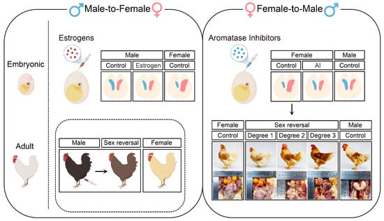 Sex-reversed birds can be obtained by altering endogenous hormone secretion through gonadal grafting. Transplantation of E13 (HH39) chicken whole testes into E3 female chicken extra-embryonic coelom can induce gonadal sex reversal [211,212]. Under the stimulation of exogenous testes, the left gonad differentiates into a testis instead of an ovary, and germ cells migrate into sex cords. However, they do not experience a meiotic process [212]. Moreover, grafting E2 female (male) sections of the presumptive mesoderm, which gives rise to gonads, to replace the equivalent tissue of male (female) at the same growth stage, induces the formation of mixed-sex chimeras [21]. Therefore, artificial transplantation of exogenous tissues can affect avian sex differentiation, leading to sex reversal.