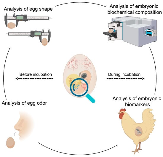 With the in-depth development of basic research and interdisciplinary communication, several gender control technologies have been developed, and some systems have even been used in poultry production [23,252,253]. In the early years, the focus of research was, for instance, to investigate the connection between the outer shape of the eggshell and the sex of hatchlings, as well as the association between the egg odor and the embryonic gender (Figure 4) [25,26]. Those studies have provided pivotal perspectives for developing avian sex control systems. However, there is no corresponding data on the likelihood of in ovo sex control based on egg shape and odor attributes [254].