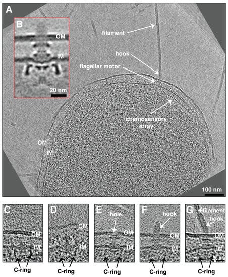 - Zhao, X.; Norris, S.J.; Liu, J. Molecular Architecture of the Bacterial Flagellar Motor in Cells. Biochemistry 2014, 53, 4323–4333. [Google Scholar] [CrossRef] [PubMed]