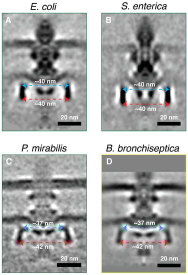 It has recently been indicated that the motors of E. coli and Salmonella are not native to these species but were acquired from Betaproteobacteria via lateral gene transfer []. Hence, we compared our structure of the P. mirabilis motor to the motors of E. coli, Salmonella, and the recently published structure of the Betaproteobacterium Bordetella bronchiseptica motor []. While all the motors look similar at this resolution, one notable difference between the motors of P. mirabilis and B. bronchiseptica on one hand, and those of E. coli and Salmonella on the other, as judged at the resolution of the available subtomogram averages, was in the shape of the C-ring (Figure 2). While the C-ring of the latter two motors appeared straight with a constant diameter of ~40 nm, the lower part of the C-ring of both P. mirabilis and B. bronchiseptica appeared wider (~42 nm) compared to the upper part of the C-ring (~38 nm, Figure 2).