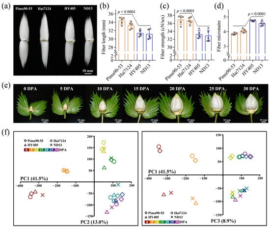Transcriptome sequencing of the G. barbadense and G. hirsutum fibers. (a) Mature cotton fibers from G. barbadense and G. hirsutum. (b) Difference in fiber length between the two cotton groups. Phenotype data were collected from five years × location agroecological environments. The significance of difference was analyzed with a two-tailed t-test. (c) Difference in fiber strength between the two cotton groups. (d) Difference in fiber micronaire between the two cotton groups. (e) Cotton boll development in G. barbadense. (f) Principal component analysis of the sequencing samples based on gene expression.