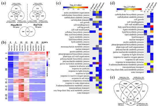 Preferentially expressed genes during cotton fiber elongation in G. barbadense. (a) Identification of the DEGs that were upregulated at 5, 10 and 15 DPA in comparison with 0 DPA. (b) Cluster analysis of the upregulated DEGs based on expression trends. The RPKM values were normalized with the z-score method. (c) GO enrichment analysis in different clusters; p-value generated from the hypergeometric test was adjusted via the Benjamini–Hochberg method, generating a Q-value; GO terms with a Q-value < 0.05 were considered significantly enriched. (d) GO enrichment analysis in the IV-I, IV-II and IV-III subgroups. (e) Forty-two genes were extracted from cluster IV, which were upregulated in G. barbadense as compared with G. hirsutum during cotton fiber elongation.