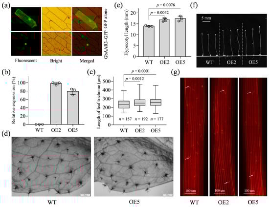To further validate the potential roles of the 42 candidate genes in cell elongation, Gbar_A05G037170 and Gbar_A05G020690 driven by a CaMV35S promoter were transferred independently into A. thaliana plants, and then their roles were determined by observing the changes of leaf trichomes and dark-grown hypocotyl cells. The two genes were selected by considering their potential as novel genes related to cotton fiber development. Gbar_A05G037170 (termed GbAAR3) is highly homologous to the AtAAR3 identified in a screen for mutants resistant to an anti-auxin []. Encoding a DCN1-like protein, GbAAR3 may regulate cullin neddylation and thus participate in auxin signaling by the SCFTIR1/AFB pathway [,]. As expected, transient expression analysis of GbAAR3 fused to green fluorescent protein (GFP) confirmed its nuclear localization (Figure 3a). Two transgenic T3 lines OE2 and OE5 were developed, in which the stable expression of GbAAR3 was confirmed by qRT-PCR (Figure 3b). Arabidopsis leaf trichomes were subsequently measured because they partly share common regulatory mechanisms with cotton fiber cells [,,,]. As a result, the transgenic OE2 and OE5 plants, compared with WT plants, showed significantly longer trichomes (Figure 3c,d). Moreover, dark-grown hypocotyls were employed because their growth results from cell elongation rather than division [,]. Here, five-day-old dark-grown OE2, OE5 and WT seedlings were measured, and then we discovered that the transgenic seedlings had significantly longer hypocotyls (Figure 3e,f). Correspondingly, longer hypocotyl epidermal cells were observed in the transgenic seedlings in a microscopic inspection (Figure 3g). Similarly, Gbar_A05G020690 (named GbTWS1) is homologous to AtTWS1 which encodes a novel small protein and is speculated to affect the functionality of the endoplasmic reticulum []. To determine the involvement of GbTWS1 in cell elongation, Arabidopsis GbTWS1-overexpressed T3 lines OE5 and OE7 were generated, and stable expression was confirmed by qRT-PCR and Western blotting (Figure S2a,b). Although the overexpression of GbTWS1 in Arabidopsis plants promoted the elongation of leaf trichomes only slightly, the transgenic seedlings produced significantly longer dark-grown hypocotyl cells and thus longer hypocotyls in comparison with WT seedlings (Figure S2c–e). These results indicate that GbAAR3 and GbTWS1 can promote cell elongation and might have contributed to cotton fiber development and that the 42 elongation-related candidate genes may have good prospects in fiber quality improvement.