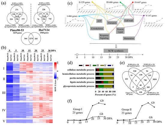 Preferentially expressed genes during SCW biosynthesis in G. barbadense. (a) Identification of the DEGs that were upregulated at 20, 25 and 30 DPA in comparison with 0 DPA. (b) Cluster analysis of the upregulated DEGs based on expression trends. The RPKM values were normalized with the z-score method. (c) Comprehensive diagram illustrating the involvement of different clusters in SCW biosynthesis. (d) Statistics on the genes related to cell wall macromolecule metabolism in different clusters. (e) The 48 genes extracted from cluster IV which were upregulated in G. barbadense as compared with G. hirsutum during SCW biosynthesis. (f) Forty-eight genes were divided into two groups based on the expression patterns of their G. hirsutum orthologs.