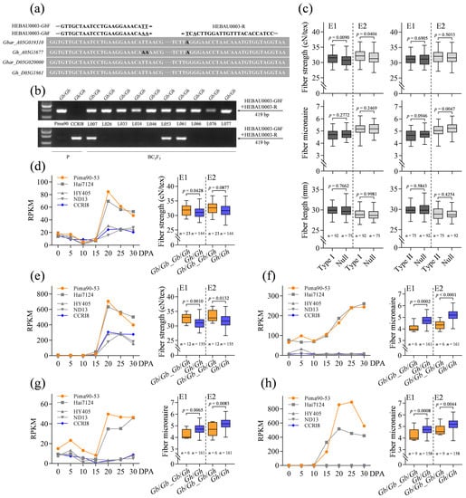 To further verify the involvement of the 48 candidate genes in fiber quality improvement, we performed the genotyping and phenotyping of a BC3F5 population developed from donor parent G. barbadense acc. Pima90-53 and recipient parent G. hirsutum acc. CCRI8, and then determined whether the introgression of the G. barbadense candidate genes into G. hirsutum could improve fiber properties. For the genotyping, SNP molecular markers of 39 candidate genes were successfully developed, which can distinguish the orthologous genes between G. barbadense and G. hirsutum accurately and easily (Figure S7). The primers of molecular markers were designed based on the SNPs between G. barbadense and G. hirsutum and the SNPs between the At and Dt subgenomes (Figure 5a; Table S8). Subsequently, in the BC3F5 population, alleles were detected at each locus, showing three types of genotypes: Gb/Gb homozygote, Gh/Gh homozygote and Gb/Gh heterozygote (Figure 5b). The phenotype data collected from Luntai (E1) and Qingxian (E2) were thus compared based on different genotypes. Interestingly enough, the type I SCW biosynthesis-related candidate genes enhanced fiber strength and did not impair fiber length and micronaire while the type II candidate genes were much more likely to improve fiber micronaire (Figure 5c; Figure S8). Gbar_A05G019310 belonging to type I shows similarity to AtIDD1 that encodes a C2H2 zinc finger protein and mediates GA signaling. GA has been proposed to promote SCW deposition in cotton fiber cells []. Here, Gbar_A05G019310 was preferentially expressed during SCW biosynthesis in G. barbadense, and its orthologous gene in G. hirsutum exhibited similar expression patterns but lower transcript levels, supported by the current transcriptome data and a supplementary RNA-seq project of G. hirsutum acc. CCRI8 (Figure 5d; Table S6). As expected, it contributed to fiber strength improvement when Pima90-53 genome fragments containing Gbar_A05G019310 were recombined into the CCRI8 genome. Similarly, another type I gene Gbar_A05G025000, encoding a hypothetical transmembrane protein with unknown functions, also enhanced fiber strength (Figure 5e). Comparative phenotype analysis also identified three type II genes Gbar_A06G015550 (Figure 5f), Gbar_A13G023450 (Figure 5g) and Gbar_D05G026930 (Figure 5h) that improved fiber micronaire significantly. Gbar_A06G015550 encodes the aldehyde dehydrogenase associated with cellular responses to oxidative stress []. Encoding the putative epoxide hydrolase, Gbar_A13G023450 is potentially involved in transforming epoxide-containing fatty acids and thereby cutin biosynthesis []. Gbar_D05G026930 encodes an uclacyanin-like blue copper-binding protein that has been implicated in lignin biosynthesis [,]. These kinds of genes are generally considered to involve stress responses, and thus the results provide a novel alternative way to improve cotton fiber quality.