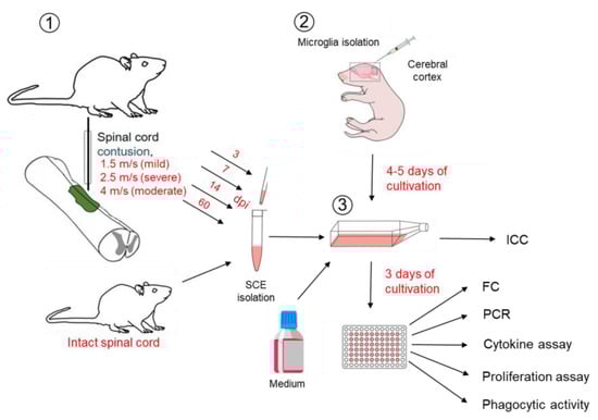- Akhmetzyanova, E.R.; Mukhamedshina, Y.O.; Zhuravleva, M.N.; Galieva, L.R.; Kostennikov, A.A.; Garanina, E.E.; Rizvanov, A.A. Transplantation of microglia in the area of spinal cord injury in an acute period increases tissue sparing, but not functional recovery. Front. Cell. Neurosci. 2018, 12, 507. [Google Scholar] [CrossRef]