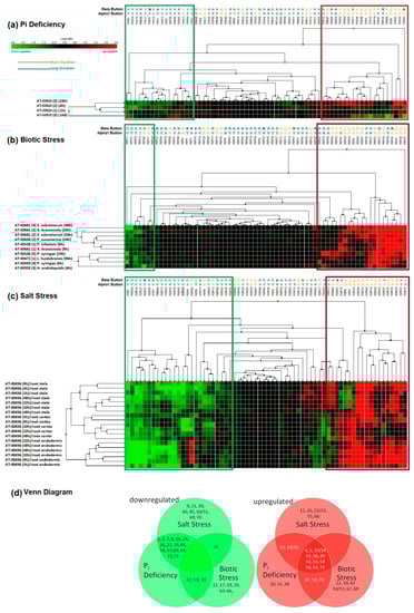 Our Genevestigator-powered meta-analysis, summarized in Venn diagrams (Figure 1d), revealed 13 PERs upregulated in response to all three stresses (short-term Pi deficiency, salt, and biotic stress). In contrast, 16 PERs were downregulated both in short-term Pi deficiency and salt stress. No PERs were downregulated under all three stresses.