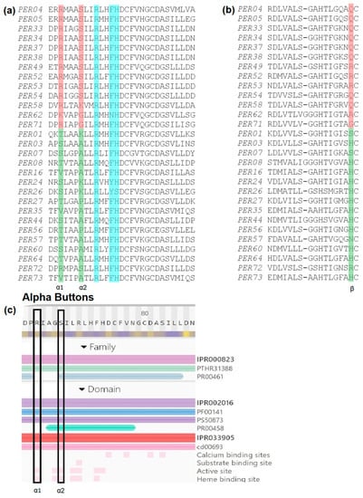 Examining the MSA, we found several amino acid sites that were conserved within each group (up- or downregulated) but differed between both groups. Specifically, and significantly for our analysis, we identified three key positions that we dubbed Alpha1, Alpha2, and Beta Buttons. At the Alpha1 Button (Figure 2a), most stress-induced peroxidases contain an arginine (R), while most downregulated peroxidases contain either a threonine (T), serine (S), or valine (V). At the Alpha2 Button (Figure 2a), most stress-induced PERs have an S, while most downregulated PERs have an alanine (A). Finally, in the Beta Button position, the upregulated PERs usually have an R or glutamine (Q), while the downregulated PERs typically have a histidine (H) in that position (Figure 2b). Expanding our analysis to all 73 PERs, we found that 28 peroxidases have either R, Q, or lysine (K) in the Beta Button position, while 33 peroxidases contain a H in this position.