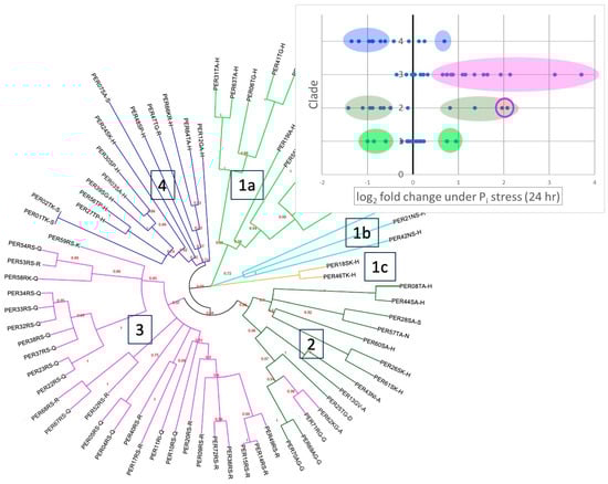 Maximum likelihood tree based on the 73 PER coding RNA sequences. The four main clades are distinguished by color and labeled 1−4. Approximate likelihood-ratio values are shown in red near the corresponding nodes. The particular amino acid at the Alpha1 and Alpha2 Buttons and the Beta Button are noted at the end of each protein name, using the single letter code. Note that Supplementary Figure S2 shows all three buttons in a rectangular phylogenetic tree for better legibility. The insert shows gene expression as log2 fold change under short-term (24 h) Pi deficiency, with ±0.5 log2 fold differentially expressed genes, highlighted by color shading. Circled in magenta are PER62 and PER71, which we postulate have convergently evolved to function like members of clade 3.