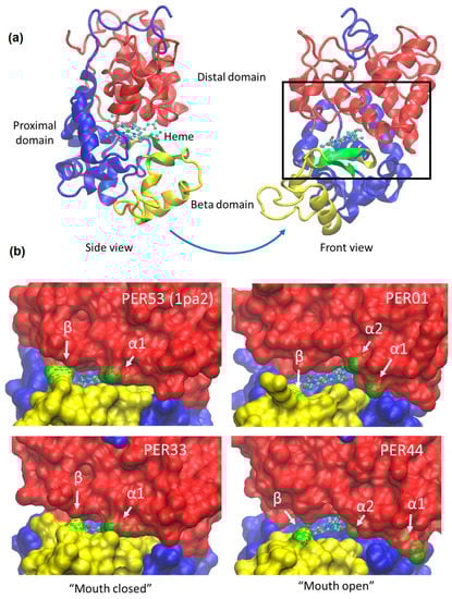 (a) Cartoon view of PER53 based on the crystal structure [17], with bound heme (ball and stick model) located between the distal domain (red), the proximal domain (blue), and the beta domain (yellow and green). The heme propionate groups, each ending with a pair of oxygen atoms (red balls), emerge from the γ-edge of the heme (to the right in the side view, toward the viewer in the front view). (b) “Front” views into the “mouth” of PER AlphaFold models and PER53 crystal structure with coloring and orientation as in Figure 4a (black rectangle), except here the green highlights are Alpha1 (α1), Alpha2 (α2) and Beta (β) Button residues (indicated by arrows). In the left column (PER53 and PER33,) Alpha2 is occluded from view, and the mouth is less open. In the right column (PER01 and PER44), the mouth is more open, as evidenced by more of the bound heme being visible. We hypothesize that the less open mouth restricts access to the heme for larger substrates while allowing access for small molecules such as H2O2, H2O, •OH, O2•−, etc.