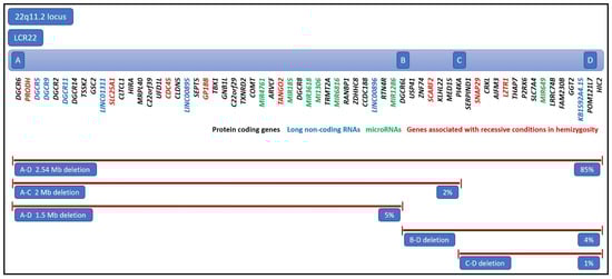 The schematic representation of the 22q11.2 region comprising LCR22 A, B, C, and D sequences and encompassing protein-coding genes, long non-coding RNAs, microRNAs, and genes expressed in functional haploinsufficiency in 22q11.2 DS.