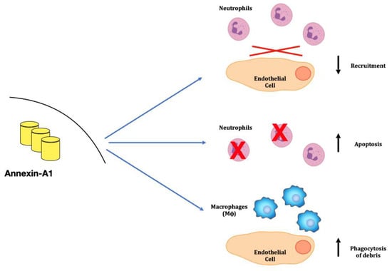 ANXA1 is a 37KDa protein expressed in cytoplasm of innate immune cells, such as neutrophils, monocytes, mast cells, macrophages, eosinophils and in minimal amounts in T-cells; ANXA1 is also expressed by some renal components, mainly by Bowman’s capsule, cells of macula densa and medullary/papillary collecting ducts [,]. ANXA1 is an anti-inflammatory protein, representing a key modulator of innate immunity [,,]. In more detail, ANXA1 may counteract inflammatory activity at different levels: one—inhibiting the recruitment of neutrophils in inflammatory areas and reducing the adhesion of these cells to endothelia [,,,]; two—promoting neutrophil apoptosis []; and three—acting as a chemoactant for monocytes and stimulating macrophages phagocytosis [] that remove necrotic debris [] (Figure 2).