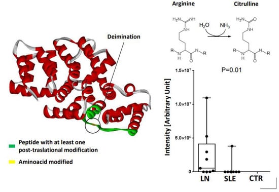 Studies in RA documented high levels of Annexin A1 in fibroblasts recovered from synovial fluids [] where this protein plays an anti-inflammatory effect correlated with the cytokine milieu and with response to steroids. Annexin A1 is also overexpressed by circulating neutrophils in SLE by a factor of 2–3 compared to control cells and is a component of NETs whose formation in patients with SLE has been associated with the activation of autoimmunity since within NETs, proteins and DNA undergo post-translational modifications []. In 67% of patients with Lupus nephritis, also Annexin A1 was shown to be modified for the presence of 1 Citrulline in place of Arginine 188 (peptide N178-L198) (Figure 3). In the unique report on circulating levels, Annexin A1 has been reported to be high in a large cohort of 219 patients with SLE, half of which had Lupus nephritis. Free ANXA1 did not correlate with any clinical variables in SLE patients. The above observations suggest that Annexin A1 is more dynamically and structurally modified in response to the inflammatory milieu in tissues and cells than in circulation, representing a possible mechanism for the generation of auto-antibodies.