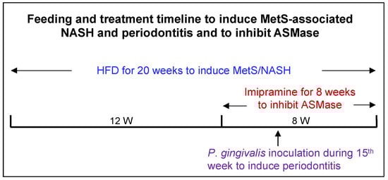The timeline for induction of MetS-associated NAFLD and periodontitis and treatment with imipramine. Six weeks old male C57BL/6 mice were fed high-fat diet (HFD) for 20 weeks to induce metabolic syndrome (MetS) and MetS-associated nonalcoholic steatohepatitis (NASH). Starting from Week 13, part of the mice were treated with imipramine for eight weeks to inhibit acid sphingomyelinase (ASMase). Starting from Week 13, part of the mice were treated with antibiotics for seven days for the preparation of oral P. gingivalis inoculation. In Week 15, part of the mice received P. gingivalis inoculation to induce periodontitis. All mice were sacrificed at the end of 20 weeks.