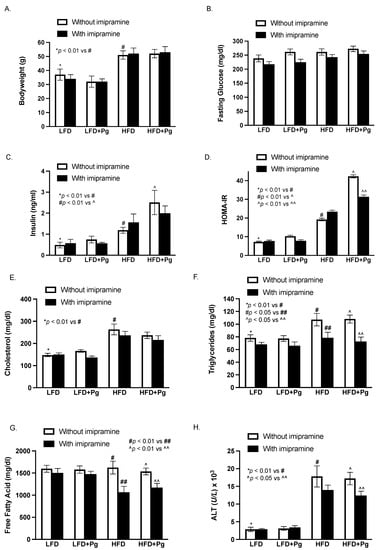 The effect of HFD feeding, oral P. gingivalis (Pg) inoculation, and imipramine treatment on the metabolic parameters and hepatic injury, including body weight (A), fasting glucose (B), insulin (C) and insulin resistance (HOMA-IR) (D), cholesterol (E), triglyceride (F), free fatty acid (G), and ALT (H) in mice. Six-week-old male C57BL/6 mice were fed HFD for 20 weeks to induce MetS and MetS-associated NAFLD and inoculated orally with Pg in the 15th week to induce periodontitis. Part of the mice were also treated with imipramine in the last eight weeks. Control mice were fed LFD and inoculated orally with a vehicle of Pg. At the end of the feeding and treatments, blood was collected, and the serum levels of the metabolic parameters were quantified. The data are mean ± SD (n = 12).