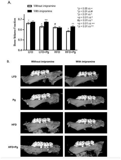 We performed micro-computed tomography (μCT) scanning on maxillae to quantify bone volume fraction (BVF). Results (Figure 3 and Table 1) showed that oral P. gingivalis inoculation and HFD feeding significantly induced alveolar bone loss by 4.90% and 5.88%, respectively, and the combination of P. gingivalis inoculation and HFD feeding further increased alveolar bone loss by 11.46%, revealing a cooperative effect of P. gingivalis inoculation and HFD feeding on alveolar bone loss. In contrast, imipramine treatment not only prevented bone loss but significantly increased the BVF by 8.47% in mice treated with P. gingivalis inoculation alone and by 7.50% in mice fed HFD and inoculated with P. gingivalis. In addition, we also measured the distance from the cemento–enamel junction (CEJ) to the alveolar bone crest (ABC) as previously described []. Results showed that P. gingivalis inoculation or HFD plus P. gingivalis inoculation significantly increased CEJ-ABC distance, but imipramine treatment reduced CEJ-ABC distance (Figure 3B–D).