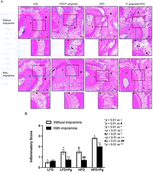 Histological analysis of periodontal tissues of mice after HFD feeding, oral P. gingivalis inoculation, and imipramine treatment. After performing the mCT of the maxillae as described above, the tissues were sectioned and stained with hematoxylin and eosin (H/E) for histological evaluation of leukocyte infiltration and bone resorption. (A) The images of the representative tissue sections with H/E staining focus on the area of the periodontal ligament, teeth, and alveolar bones. The images in the insets were enlarged, and the arrows indicated infiltrated leukocytes. Scale bar = 100 μm. (B) The inflammatory scores were made according to the degree of leukocyte infiltration and bone resorption as described in Materials and Methods. The data are mean ± SD (n = 12). T: tooth; B: alveolar bone.