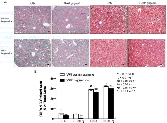 To elucidate how periodontitis affects NAFLD, we performed a histological analysis of liver tissue. Results from hematoxylin and eosin (H&E) staining (Figure 5) showed that while P. gingivalis inoculation alone had no effect on fat accumulation in the liver, HFD feeding, or HFD feeding, plus P. gingivalis inoculation-induced fat accumulation. In contrast, imipramine treatment reduced the liver fat content. To quantify the amount of fat in the liver, we performed Oil Red O staining on liver tissue sections. Results (Figure 6A,B) showed that HFD feeding markedly increased fat accumulation, and the combination of HFD feeding and P. gingivalis inoculation further increased it. However, imipramine treatment moderately ameliorated hepatic steatosis induced by HFD feeding or by HFD feeding plus P. gingivalis inoculation.