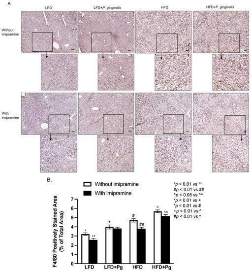To assess the effect of P. gingivalis inoculation, HFD feeding, and imipramine on hepatic inflammation, we performed immunohistochemical staining to detect F4/80, a biomarker for murine macrophages []. Results (Figure 7A,B) showed that either P. gingivalis inoculation or HFD feeding significantly increased F4/80 expression, and the combination of P. gingivalis inoculation and HFD feeding further increased its expression. In contrast, imipramine treatment significantly reduced F4/80 expression.