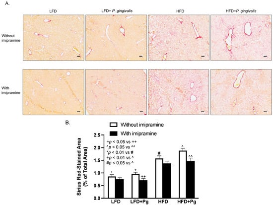 In addition to hepatic steatosis and inflammation, we also determined the effect of P. gingivalis inoculation, HFD feeding, and imipramine on hepatic fibrosis. Results from Sirius Red staining of liver sections showed that HFD feeding, but not P. gingivalis inoculation, markedly increased collagen content in liver sections, and the combination of P. gingivalis inoculation and HFD feeding further increased liver collagen content (Figure 8A,B). Contrarily, imipramine treatment significantly reversed the stimulatory effect of P. gingivalis inoculation and HFD feeding on hepatic fibrosis (Figure 8A,B).