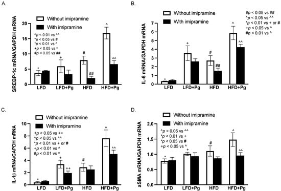 The effect of HFD feeding, oral P. gingivalis (Pg) inoculation, and imipramine treatment on hepatic expresScheme 57. BL/6 mice were fed HFD for 20 weeks to induce MetS/NAFLD and orally inoculated with Pg to induce periodontitis, RNA was isolated from the livers of all mice and the following mRNA was quantified using real-time PCR and normalized to GAPDH mRNA: (A) Sterol regulatory element-binding proteins (SREBP)-1c; (B) IL-6; (C) IL-1b; (D) alpha-smooth muscle actin (aSMA). The data are presented as means ± SD (n = 12).
