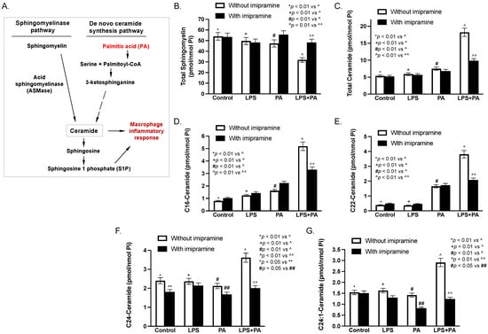 The above results in Figure 3, Figure 4, Figure 5, Figure 6, Figure 7 and Figure 8 showed that imipramine effectively inhibited the detrimental effect of P. gingivalis inoculation and/or HFD feeding on periodontitis and NAFLD progression. To demonstrate how imipramine affects sphingolipid metabolism, we determined the effect of imipramine on ceramide production in macrophages in vitro since it is well-known that macrophages play a crucial role in the pathogenesis of both periodontitis and NASH [,,,]. Results showed that while either LPS or PA slightly reduced total sphingomyelin, the combination of LPS and PA markedly reduced it (Figure 10B and Table 2), confirming our previous report that LPS and PA synergistically promote sphingomyelin hydrolysis []. In contrast, imipramine, as an inhibitor of ASMase, inhibited the effect of LPS plus PA on sphingomyelin hydrolysis. Consistently, results showed that LPS and PA synergistically increased total cellular ceramide content, but imipramine reduced total ceramide content increased by LPS plus PA (Figure 10C and Table 3). Similar synergistic effects of LPS and PA and the inhibitory effect of imipramine were also observed on C16-, C22-, C24-, and C24:1-ceramide (Figure 10D–G and Table 3).