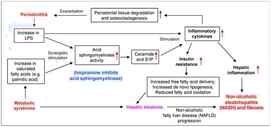 Our studies exploring the molecular mechanisms involved in the crosstalk between LPS and PA have shown that dysregulation of sphingolipid metabolism and increased production of some bioactive sphingolipids such as ceramide and sphingosine 1-phosphate (S1P) played a pivotal role [,]. Specifically, we have shown that in macrophages, LPS and PA synergistically stimulate acid sphingomyelinase (ASMase), thus leading to increased hydrolysis of sphingomyelin and increased cellular ceramide content []. The increase in cellular ceramide led to the upregulation of proinflammatory genes in macrophages [,]. We have also shown that inhibiting ASMase reduced the cellular content of ceramides in macrophages and improved both NAFLD and periodontitis in animal models [,]. However, it remains unclear if ASMase-related dysregulation of sphingolipid metabolism is involved in the interaction of periodontitis with NAFLD progression.