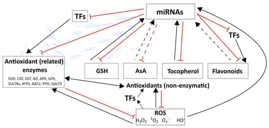Interactions between the redox system and miRNAs. Changes in the level of reactive oxygen species (ROS) and antioxidant compounds and the activity of the antioxidant system may affect the amount of miRNAs directly or indirectly through the modulation of their biogenesis. ROS: hydrogen peroxide (H2O2), superoxide radical (O2.−), hydroxyl radical (HO.), singlet oxygen (1O2). Main antioxidants: glutathione (GSH), ascorbate (AsA), tocopherol, and flavonoids. Antioxidant (related) enzymes: superoxide dismutase (SOD), catalase (CAT), glutathione-S-transferase (GST), ascorbate oxidase (AO), ascorbate peroxidase (APX), glutathione peroxidase (GPX), sulfate transporters (SULTRs), ATP sulfurylase (ATPS), nucleobase ascorbate transporter 2 (NAT2), polyphenol oxidase (PPO), and galactosyl transferase 9 (GALT9). TFs—transcription factors. The solid lines indicate such relationships which are supported by previous studies cited in the text. The dashed lines show supposed relationships which should be confirmed in future experiments.
