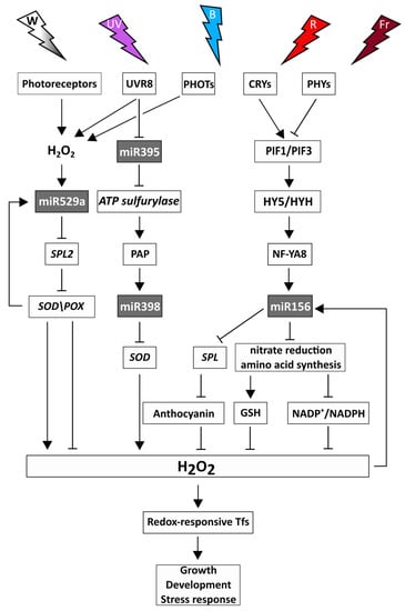 Light-dependent regulatory interactions between the redox system and miRNAs. The changes in light intensity and spectral compositions modulate the redox- and miRNA-responsive biochemical processes in plants which affect growth, development, and stress response. White light: W-white color, UV-B light: UV-purple color, blue light: B-blue color, red light: R-red color, far-red light: Fr-burgundy color. Photoreceptors: cryptochromes (CRYs), phytochromes (PHYs), phototropins (PHOTs), UV RESISTANCE LOCUS 8 (UVR8). PIF1, 3: PHYTOCHROME INTERACTING FACTORS 1, 3, HY5: LONG HYPOCOTYL5 TRANSCRIPTION FACTOR, SPL: SQUAMOSA-PROMOTER BINDING PROTEIN-LIKE, PAP: 3′-phosphoadenosine 5′-phosphate, SOD: SUPEROXIDE-DISMUTASE, POX: GUAIACOL-PEROXIDASE, HY5: ELONGATED HYPOCOTYL5, HYH: HY5 HOMOLOG, NF-YA8: NUCLEAR FACTOR Y A8, GSH: glutathione.