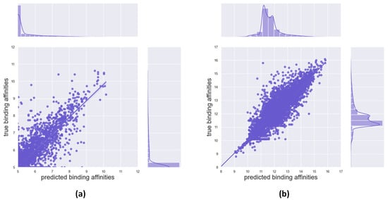 Figure 1 displays the relationship between the predicted binding affinity and the true value. Upon analysing the model prediction, the linear regression curves between the true and predicted values are almost indistinguishable from the diagonal line, indicating an excellent fit between the predicted and true values. Moreover, the distribution trend of the sample size between the predicted and actual values closely aligns, further validating the model’s accuracy in making precise predictions.