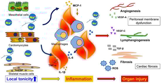 Under renal failure conditions with high salt intake, TonEBP plays a crucial role in the development of inflammation and tissue damage in the heart and peritoneal membrane. In 5/6Nx/NaCl mice with renal failure, high salt intake upregulates TonEBP in mesothelial cells and cardiomyocytes via increased local tonicity due to accumulation of sodium. Activation of TonEBP induces MCP-1 expression, leading to macrophage infiltration and upregulation of inflammatory cytokines, at least partly via the TonEBP–MCP-1 pathway. Inflammation causes tissue damage in the heart and peritoneal membrane, leading to cardiac fibrosis and high peritoneal transport rate with neoangiogenesis and lymphangiogenesis in PD.