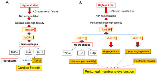 Mechanisms of tissue-sodium-accumulation-induced cardiac fibrosis and peritoneal membrane dysfunction via TonEBP activation. (A) Heart; (B) peritoneal membrane. (A) High salt intake induces activation of TonEBP, which upregulates MCP-1 expression by cardiomyocytes, leading to macrophage infiltration via the TonEBP–MCP-1 pathway in CKD [50]. Macrophages express inflammatory mediators such as TNF-α, IL-6, and IL-1, leading to induction of TGF-β in inflammation during the fibrosis process [78]. TonEBP plays an important role in cardiac inflammation and cardiac fibrosis in patients with renal failure and high salt intake. (B) Excessive dietary salt intake under renal dysfunction enhances accumulation of sodium, leading to activation of TonEBP [50]. TonEBP upregulates MCP-1, inflammatory cytokines, VEGF-A, and VEGF-C in vivo. IL-6 enhances MCP-1 and VEGF-A expression [74], leading to further macrophage infiltration and angiogenesis. High-tonicity conditions upregulate expression of MCP-1, IL-6, VEGF-A, and VEGF-C by mesothelial cells and macrophages via TonEBP activation [74]. TonEBP regulates inflammatory and angiogenetic changes in the peritoneum of CKD patients. These structural changes result in peritoneal membrane dysfunction.