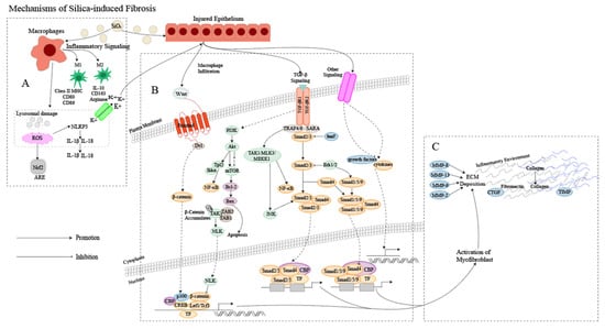Mechanism of silica-induced fibrosis. (A) Alveolar macrophages (AMs) engulf silica dust, causing them to turn into dust cells. Subsequently, AMs may synergize with alveolar epithelial cells (AECs) to release a large amount of ROS to participate in oxidative stress reactions, activate NOD-like receptor thermal protein domain associated protein 3 (NLRP3) inflammatory bodies through lysosomal damage and potassium outflux, and activate the release of inflammatory mediator interleukin (IL) -1β, IL-18 and other cytokines inducing epithelial–mesenchymal transition (EMT). Meanwhile, AMs can polarize into M1 and M2 types, playing a role in promoting inflammation, fibrosis, and antigen presentation, increasing the proliferation of lung fibroblasts and collagen synthesis and secretion, and promoting the formation of fibrosis through apoptosis and autophagy. (B) Ongoing damage and damage to lung cells by silica lead to pathological overdeposition of extracellular matrix (ECM) proteins accompanied by upregulation of myofibroblast activity, resulting in a chronic inflammatory environment of macrophage and immune cell infiltration. In this cellular environment, cytokines and growth factors are released in large quantities, activating many signaling cascades, including members of the transforming growth factor-beta (TGF-β) family and Wingless/Int (Wnt) 1, the phosphatidylinositol 3-kinase (PI3K)/protein kinase B (AKT)/mammalian target of rapamycin (mTOR) pathway and other pathways. (C) Fibroblasts then aggregate in the area of injury, and the combination of ECM degradation by MMPs and excessive collagen deposition leads to granuloma formation and lung tissue remodeling.