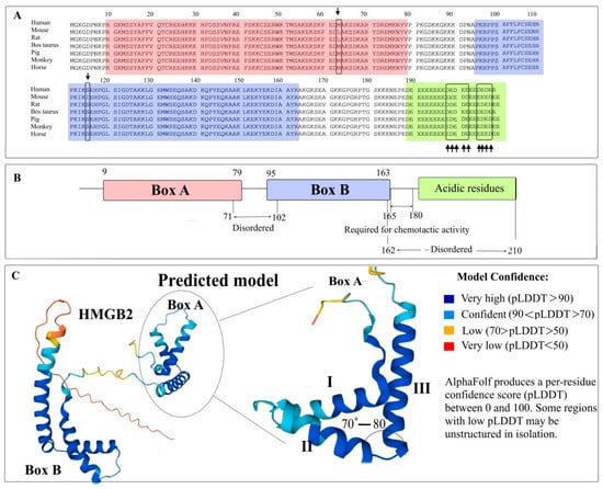 Structure of the mammalian HMGB2 proteins. Panel (A)—amino acid sequence alignment of the HMGB2 proteins (the sequences retrieved from UniProt database). The DNA-binding domains (Box A and Box B) are marked with red and blue boxes, respectively. Light green box corresponds to the C-terminal acidic region. The arrows indicate the sites of amino acid substitutions. Panel (B)—the schematic representation of HMGB2 domains. Panel (C)—tertiary structure of HMGB2 predicted using AlphaFold []. I, II and III—three α-helices within the Box A.