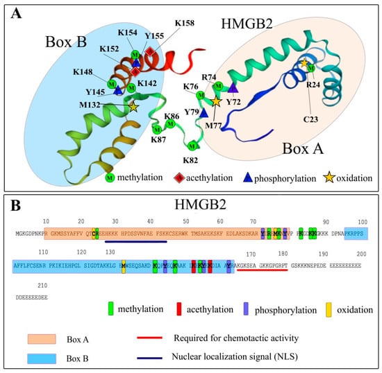 Post-translational modifications (PTMs) of calf thymus HMGB2. Panel (A)—schematic representation of potential PTM site location. Panel (B)—potential HMGB2 PTM sites are concentrated in the Box B and within the linker region between the two HMGB domains. Figure was prepared using previously published materials [].