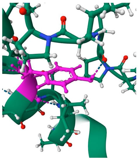 Local structure of Y155 (purple) phosphorylation site. The hydrogen bonding between Y155 and Pro8 is shown. The color scheme is the following: red—oxygen atoms; blue—nitrogen; gray—hydrogen; green—carbon.