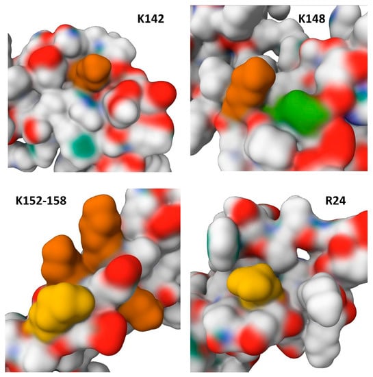 Recently, the presence of potential methylation sites in HMGB2 at positions R24, R73, K76, K82, K85, K86, K141, K147 and K154 were reported []. Most of the identified methylated sites, namely K76, K141, K147, and K154, are highly conserved in HMGB1 and HMGB2. In case of HMGB1, their location corresponds to the positions of “non-acetylated” lysines described in the literature []. Reasons for the inability to deacetylate lysines in these sites are probably related to the presence of methylation, which can prevent acetyltransferase from modifying these amino acid residues. Along with acetylation, the charge of these regions also appears to be conservative, which is likely important for the DNA-binding properties of the HMGB domains. The local environment of these methylation sites (Figure 5) demonstrates the very strong structural impact of PTMs, which also explains their conservatism and possible effect on intermolecular interactions of the HMGB domain.
