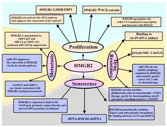 The expression level of HMGB2, in contrast to that of HMGB1, is more often associated with cell differentiation, cellular senescence, and the ability of embryonic and adult stem cells to differentiate [,,].