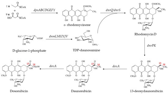 - Niraula, N.P.; Kim, S.-H.; Sohng, J.K.; Kim, E.-S. Biotechnological doxorubicin production: Pathway and regulation engineering of strains for enhanced production. Appl. Microbiol. Biotechnol. 2010, 87, 1187–1194. [Google Scholar] [CrossRef] [PubMed]