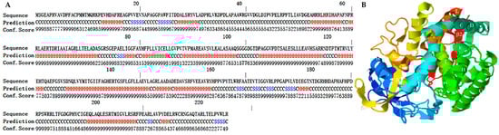 The secondary structure and three-dimensional model of DoxA predicted by I-TASSER. (A): the secondary structure of DoxA (H was the α helix; S was the β strand; C was the random coil), (B): the three-dimensional model of DoxA.