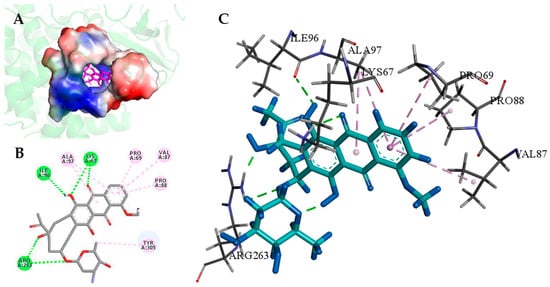 Based on the complete DoxA-heme three-dimensional model, the molecular docking of the substrate daunorubicin into the model was subsequently performed using the docking program GOLD. According to the docking results in Figure 3, the binding sites of daunorubicin to DoxA-heme were located at the center of the protein structure and were mainly dependent on hydrogen bonds and π-alkyl hydrophobic interactions. The amino acid residues 67Lys, 96Ile, and 263Arg could form hydrogen bonds with daunorubicin, while the residues 69Pro, 87Val, 88Pro, 97Ala, and 305Tyr could form hydrophobic interactions with daunorubicin. In addition, the four residues 69Pro, 87Val, 88Pro, and 97Ala binding to the first benzene ring of daunorubicin were considered the key sites in the binding pocket region (Figure 3).