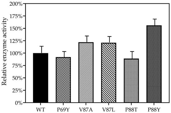 As shown in Figure 4, the relative enzyme activity was defined as 100%. It was found that the enzyme activities of the mutants DoxA(P69Y) and DoxA(P88T) decreased, while the activities of DoxA(V87A), DoxA(V87L), and DoxA(P88Y) were enhanced, showing 22%, 21%, and 56% increases in the conversion efficiency of daunorubicin to doxorubicin compared with the wild-type DoxA, respectively. The residue 87V was a strongly hydrophobic amino acid. When it was mutated to the less hydrophobic amino acids, such as alanine and isoleucine, the enzyme activity increased rather than decreased. It was speculated that the hydrophobicity of V87A and V87L did not weaken their hydrophobic interactions with the substrate. The residue 88P was a weak nonpolar hydrophobic amino acid. It was interesting that when 88P was mutated to the hydrophobic amino acids, such as tyrosine and serine, the enzymatic activity showed an increasing and decreasing trend, respectively. It might indicate that there was no apparent correlation between the hydrophobicity or hydrophilicity of amino acids, the binding sites of substrates, and the changes in enzyme activity.